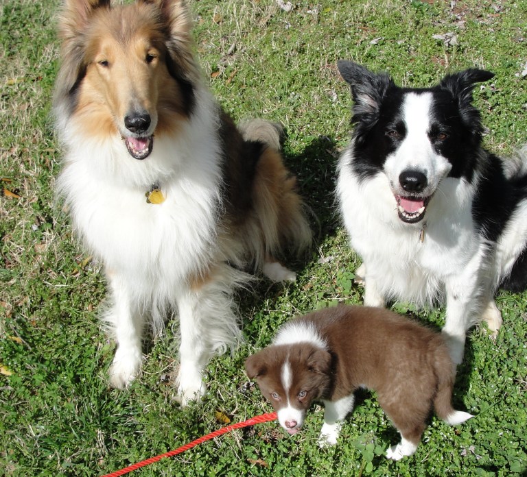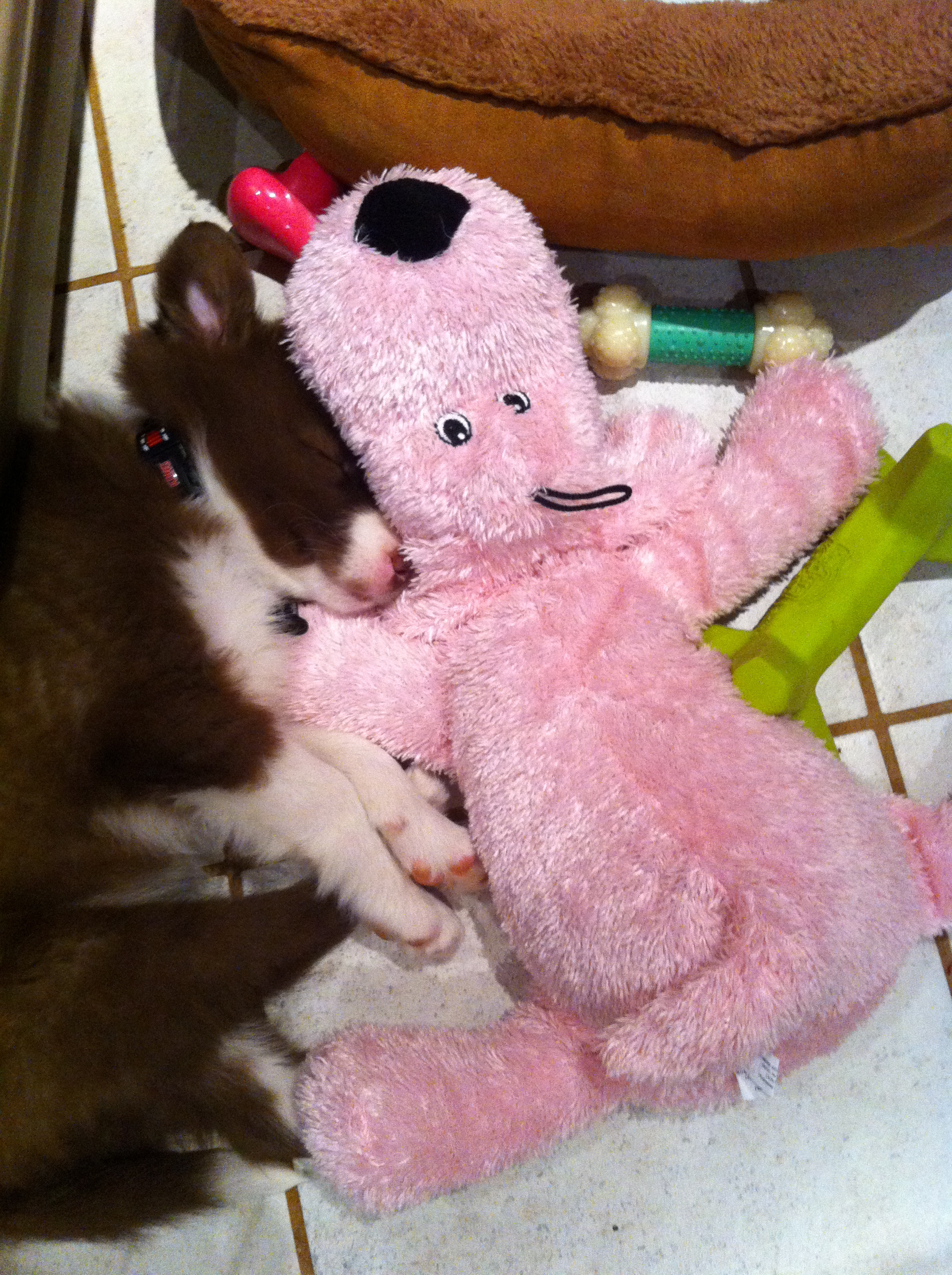 I picked her up on Friday at the Atlanta airport. When I came out of the air cargo office with her – there was a rainbow waiting for us. So – now I know what’s at the end of a rainbow – a beautiful, cute, loving, playful, fiery – oh so funny character of a puppy in a red and white coat. Thanks so much to her breeder, Jan, for trusting me with her. And what a great family I get to join too.