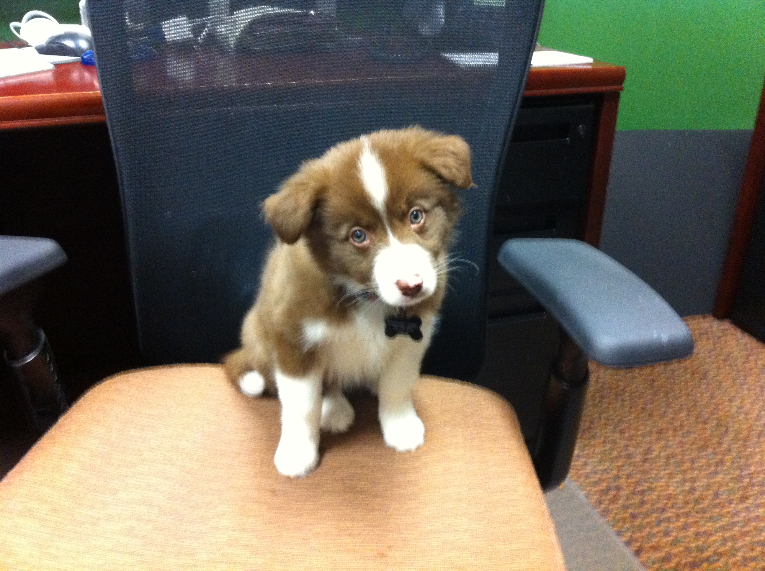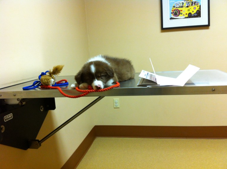 The next day she got to meet my vet. We had to wait in the lobby for awhile, but she was a trooper and enjoyed “puppy watching.” As you can see – she was very relaxed about the whole experience and of course – everyone loved her.