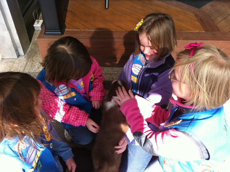 Since then we’ve been doing lots of playing and trying to experience all sorts of different things. Yesterday she met a group of girl scouts. They were so cute with her. One of them said – I can hear her purring. Ha ha! I don’t think so – but she was enjoying it and giving them lots of kisses. And yes, we bought a box of cookies.