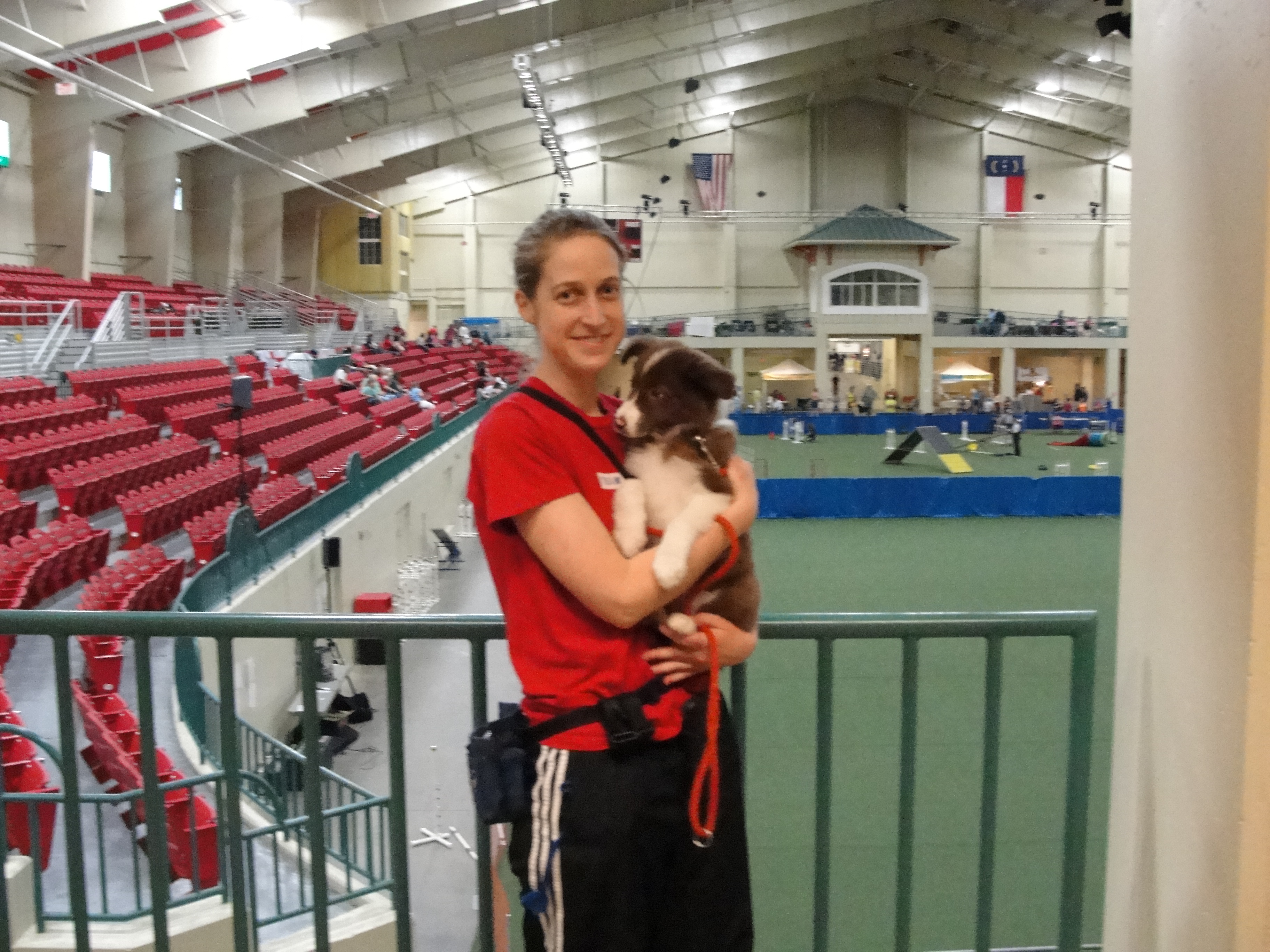She had a great time. We got lots of compliments on how well she did and how confident she seemed. Oh and of course – how cute she is. She got to see flags flapping in the wind, she walked on artificial turf, got treats on metal stairs, played a little in the stands, spent a little time inside in the crate, did a few restrained recalls and met lots of new friends.