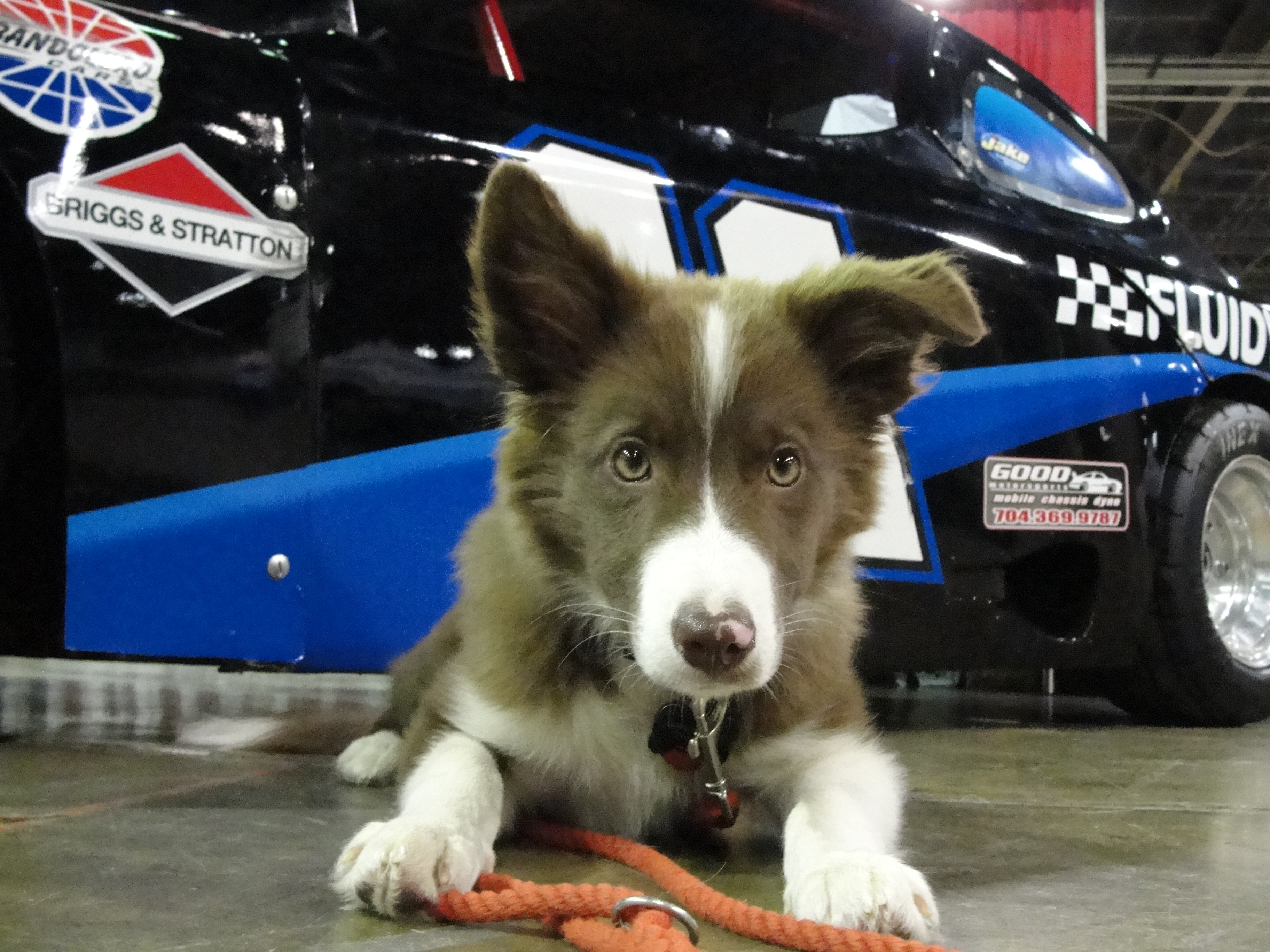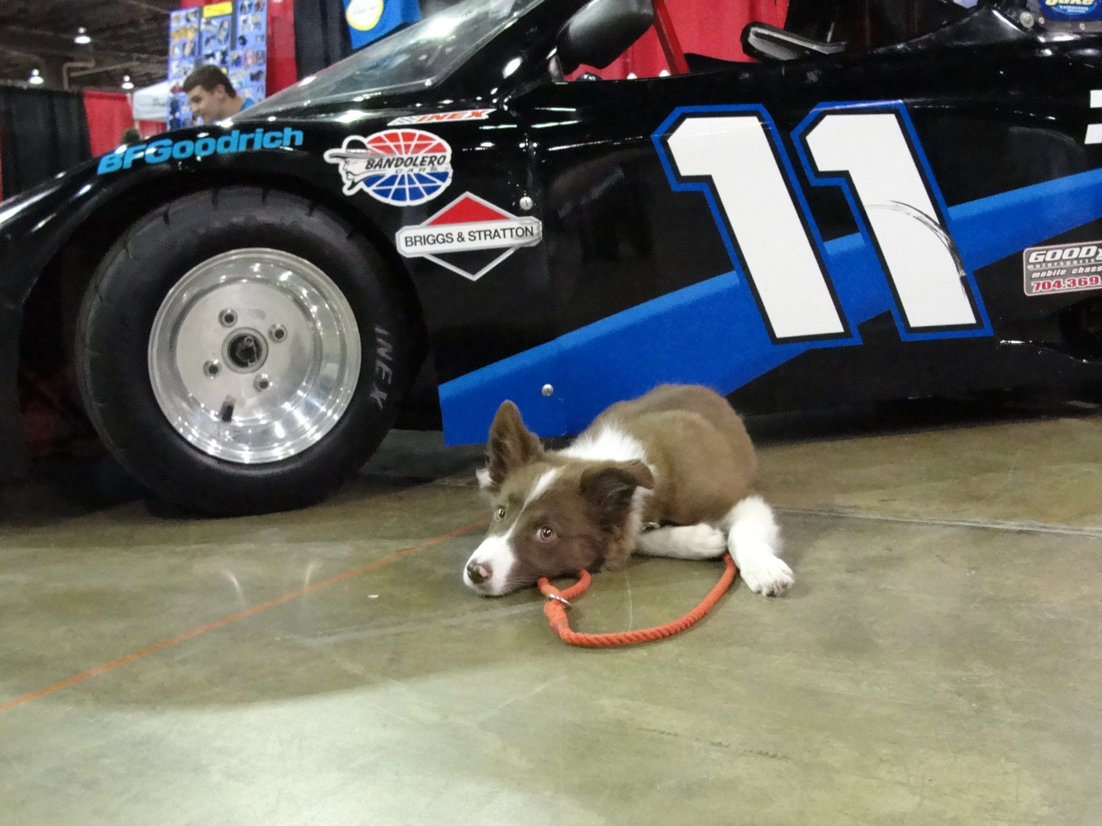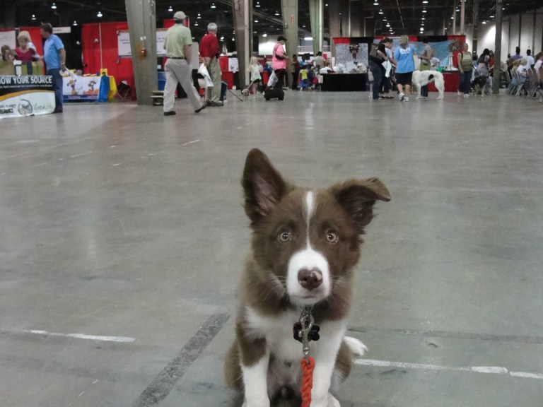 After puppy class on Saturday, Phenom and I went to the Charlotte Pet Expo. We had a great time. Another super socialization opportunity. Lots of different dogs – Bull Dogs, Pit Bulls, German Shepherds, Labs, Schnauzers, Italian Greyhounds, Papillons, Great Pyrenees and more – all really well-behaved. She saw wheelchairs, kids, all sorts of people, dogs in strollers, a café, announcer on stage and a concrete floor. Her favorite parts? Kids and the ferret booth.
