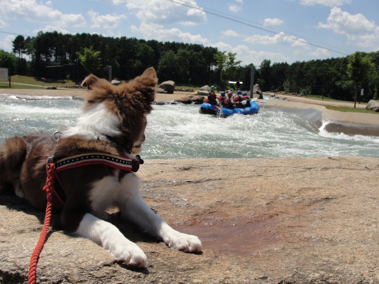 I was amazed at how well she handled everything. She sat right next to rapids, climbed all over the rocks, walked under people ziplining overhead, watched people riding bikes, saw people in hats, kayakers wearing helmets and kids carrying paddles.