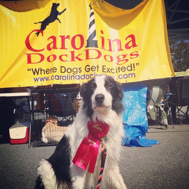 So we were at the vet for his senior wellness exam. Afterward we were walking around, and I saw the dock diving competition across the street. So we walked over and on a whim I just asked if we could try it. Sure! They said. You can do some practice runs and even try a novice jump. So we signed up. Everyone was so nice and helped us figure out what to do.